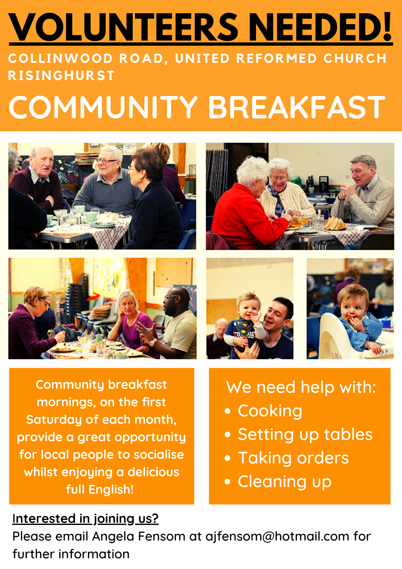 Additionally, we also have a shortage of volunteers to help us run our popular, monthly breakfast morning, which takes place on the first Saturday of every month. We’re looking for people to help with all roles, from cooking breakfasts to helping take orders and clean up. We already have a small friendly group of volunteers who will be happy to show you the ropes! Please get in touch if you are interested in helping with this event.